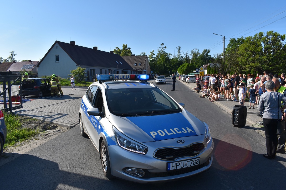 Pod koniec pikniku wspólnie ze strażakami z Ochotniczej Straży Pożarnej w Miłosławiu przedstawiliśmy scenkę, w której pojazd uczestniczy w wypadku i w środku zostaje uwięziona osoba z podejrzeniem urazu kręgosłupa. Można było zobaczyć jak działają służby i jak ważne jest zapinanie pasów oraz bezpieczeństwo wszystkich uczestników ruchu drogowego. Strażacy po rozcięciu pojazdu specjalistycznym sprzętem wydobyli osobę i we właściwy sposób przełożyli na deskę, aby dalej móc ją transportować.