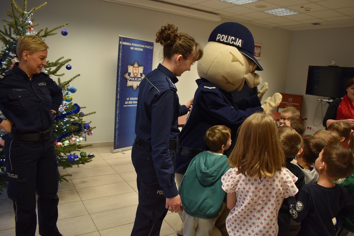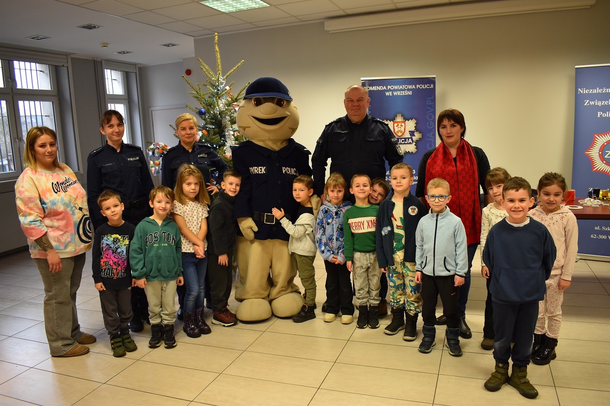 Zielone drzewko oczywiście już czekało na dzieciaki w Policyjnym Centrum Edukacji Bezpieczeństwa. Do pomocy przedszkolaki zaprosiły Komendanta Powiatowego Policji we Wrześni insp. Konrada Bartłomiejczaka, I Zastępcę Komendanta nadkom. Leszka Miedzińskiego, Naczelnika Wydziału Prewencji podinsp. Justynę Walińską oraz mł. asp. Olgę Panowicz.