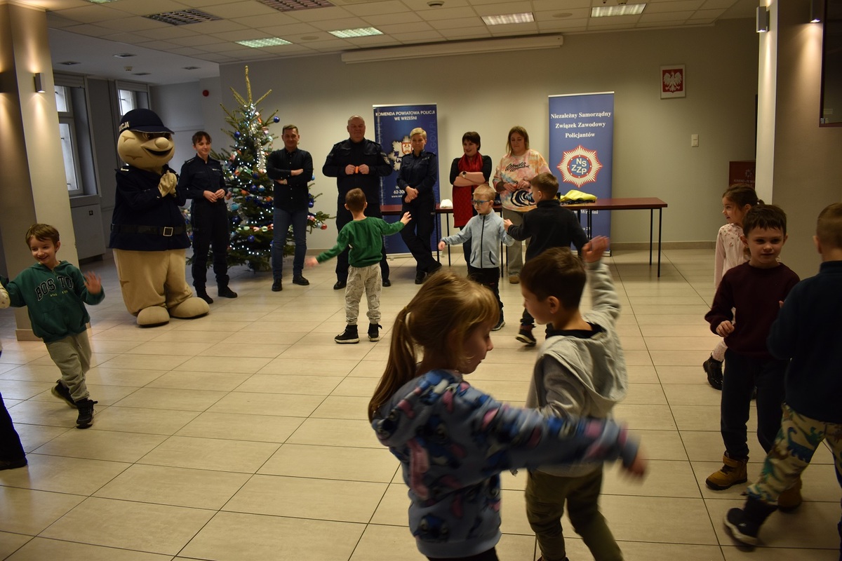 W trakcie ubierania choinki na dzieciaki czekała pewna niespodzianka od wrzesińskich policjantów. Specjalnie dla nich z Pyrkowej Kariny przyjechał Sierżant Pyrek żeby też pomóc przy ubierania choinki oraz po to. aby przybić swoją pieczątkę na rączkach dzieci.