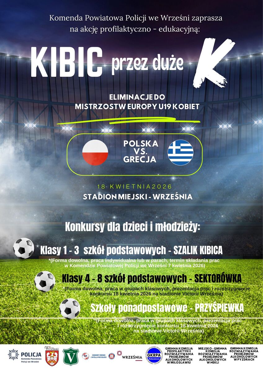 Komenda Powiatowa Policji we Wrześni zaprasza na akcje profilaktyczno – edukacyjną pn.: „Kibic przez duże K”, która skierowana jest dla uczniów szkół podstawowych i ponadpodstawowych z powiatu wrzesińskiego. Przedsięwzięcie odbędzie się 18 kwietnia 2026 roku na Stadionie Miejskim klubu piłkarskiego Victoria Września przy ul. Kosynierów 1, gdzie odbędą się Eliminacje do Mistrzostw Europy U19 Kobiet w piłkę nożną, a mecz rozegra reprezentacja Polski i Grecji.